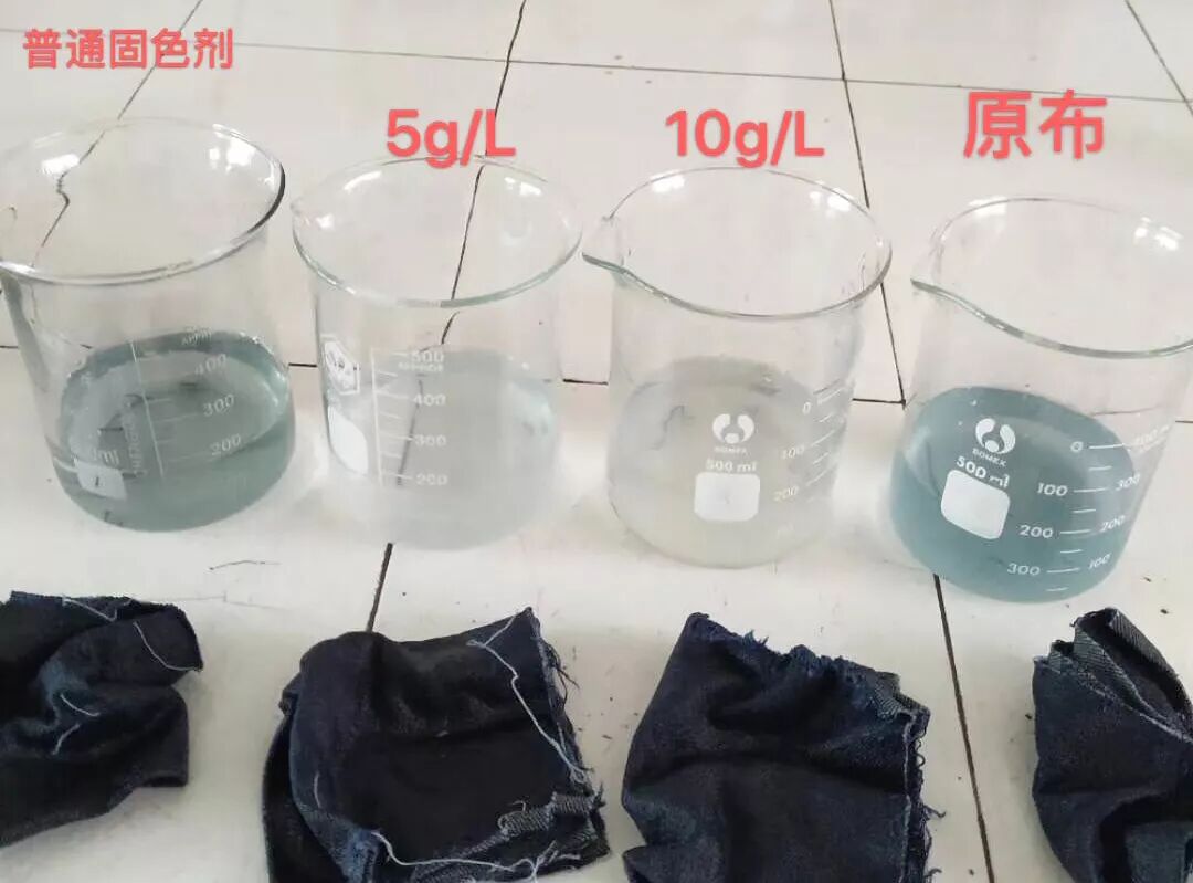 特别适用于牛仔织物的泡水牢度提升,整理过的牛仔织物在洗衣粉溶液里浸泡二十四小时亦不掉色,且色变小